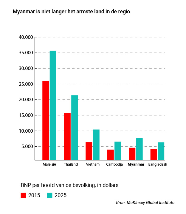 Vanaf het moment dat de democratisering inzette, geldt Myanmar als een economische belofte. Na vijftig jaar gingen opeens de grenzen open; de sancties werden opgeheven en investeerders stortte zich massaal op Myanmar. Waarom is niet moeilijk te bedenken: het land ligt strategisch tussen twee economische grootmachten, China en India. Terwijl de bevolking van omringende landen zoals Thailand ouder en duurder wordt, is Myanmar een land vol jonge en goedkope arbeidskrachten. En dan is er nog de lange kustlijn (Nederlands stuurde al een ‘visserij-missie’), de vruchtbare grond (voor het regime was Myanmar de grootste exporteur van rijst ter wereld) en een overvloed aan grondstoffen, van goud en jade tot olie en gas.